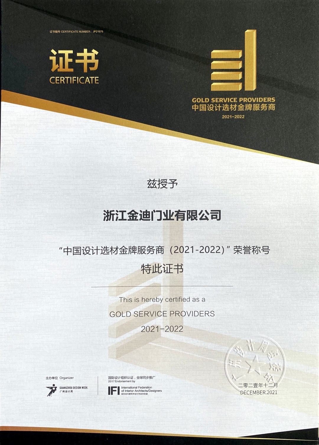 此次评选中,金迪木门凭着优秀的设计整合能力、良好的服务口碑,获得了“中国设计选材金牌服务商(2021-2022)”荣誉称号。